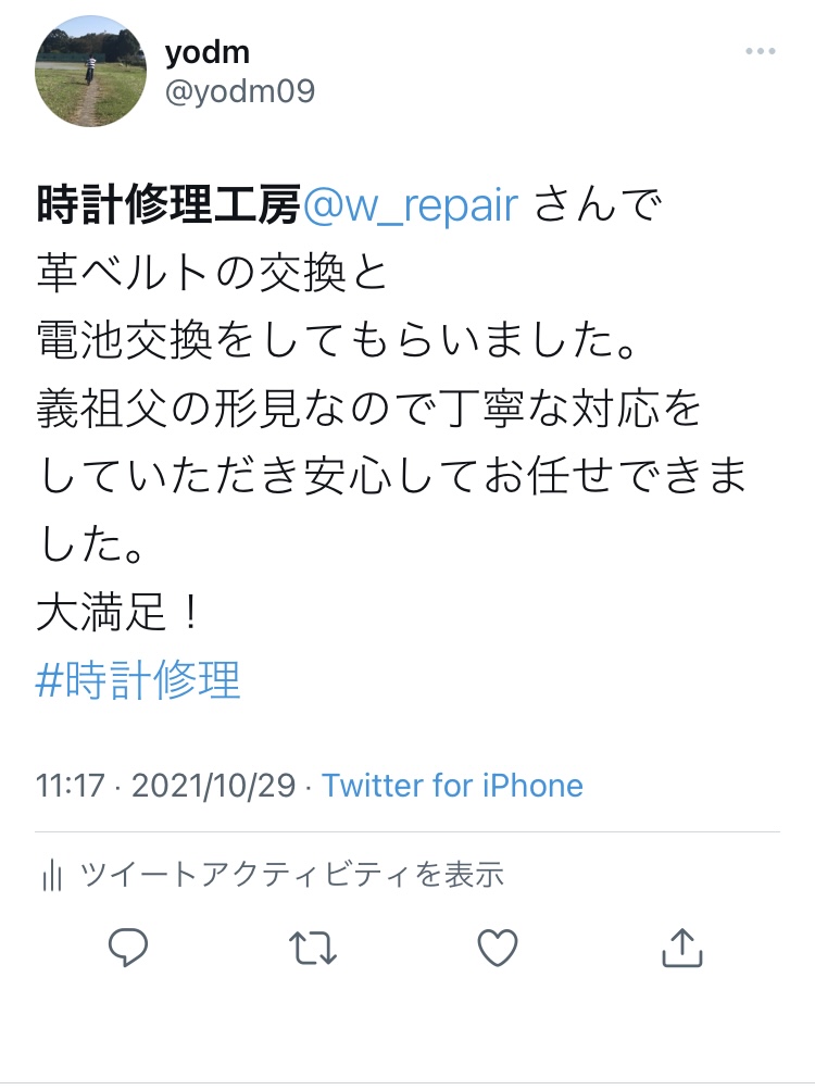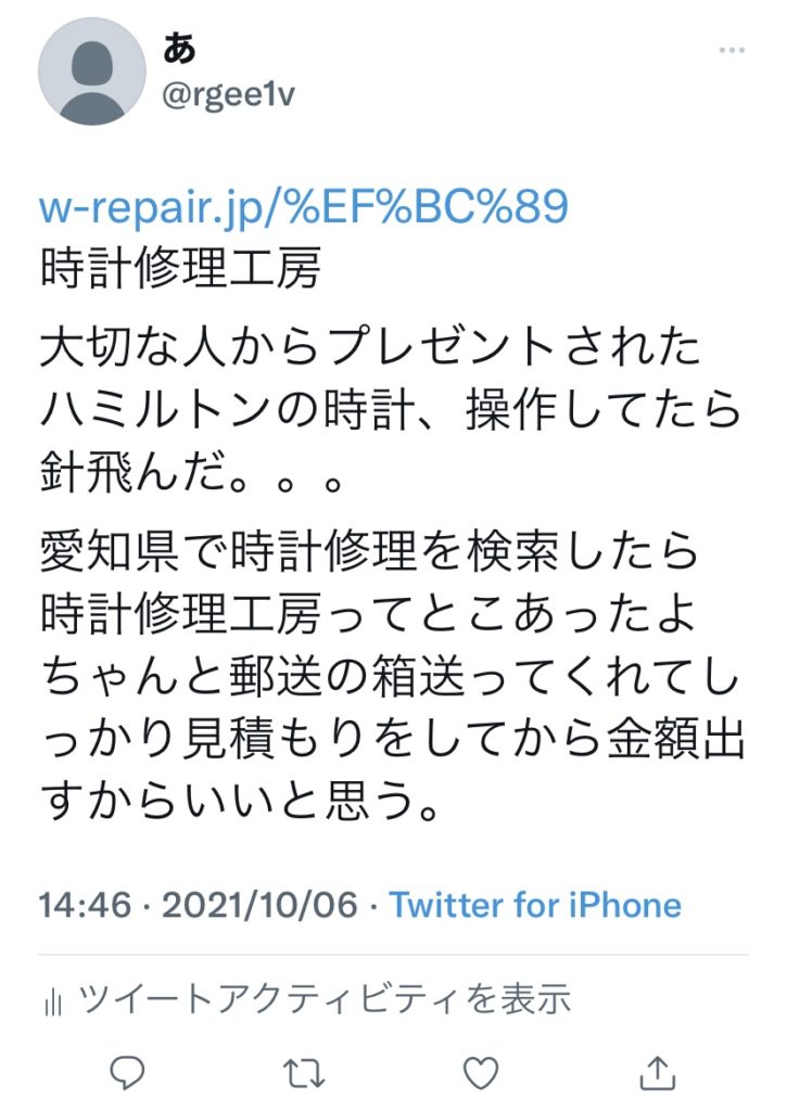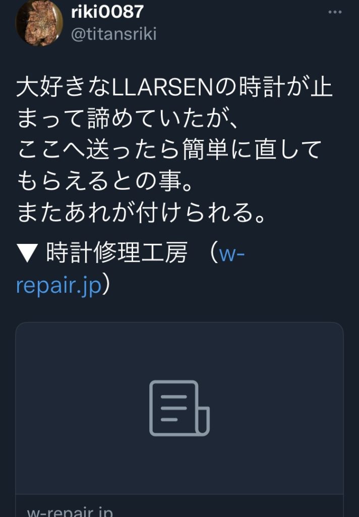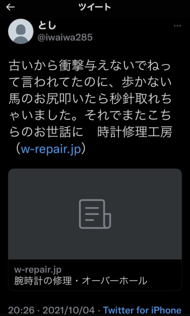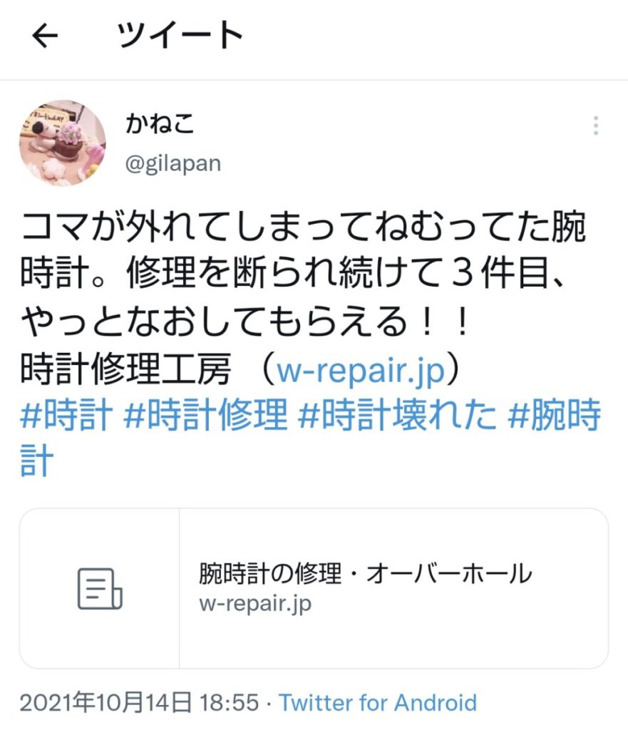 時計修理工房 (https://t.co/icnhUQpg58)というところを見つけて依頼。すごく丁寧に対応してくださって、無事手元に戻ってきたよ。よかった~。 pic.twitter.com/K6gREoOJZS