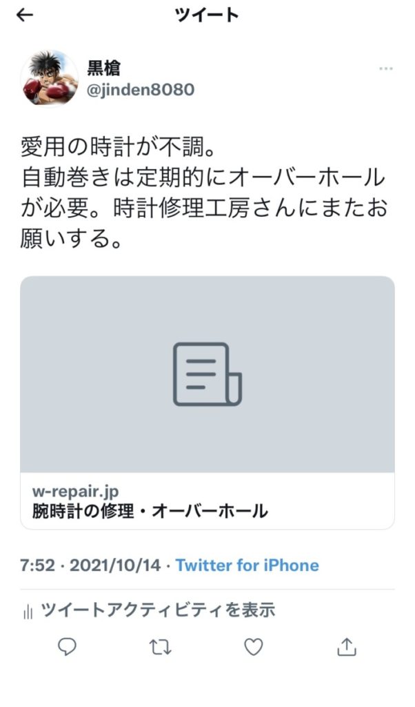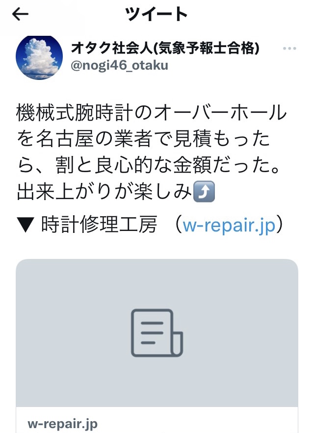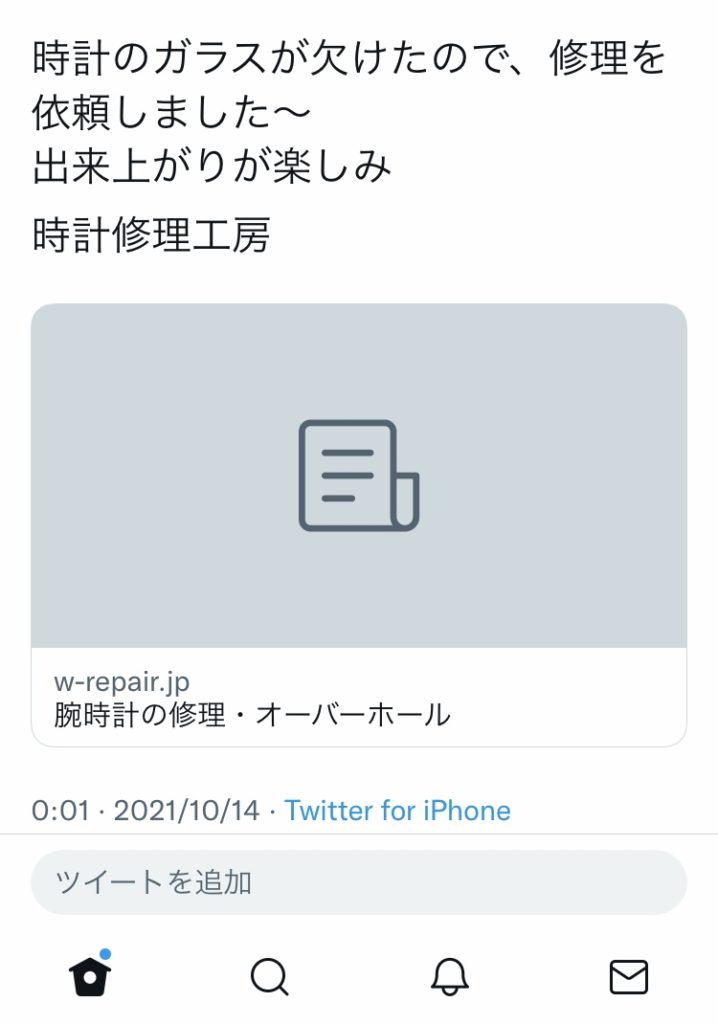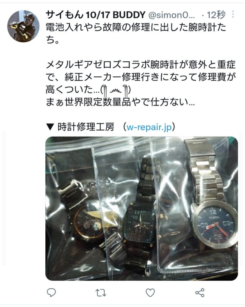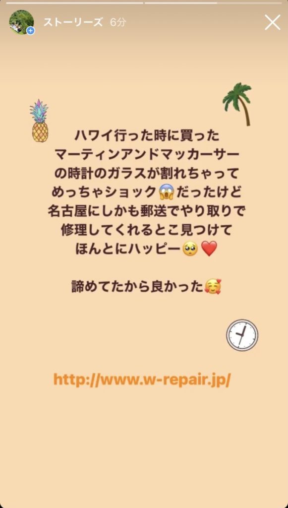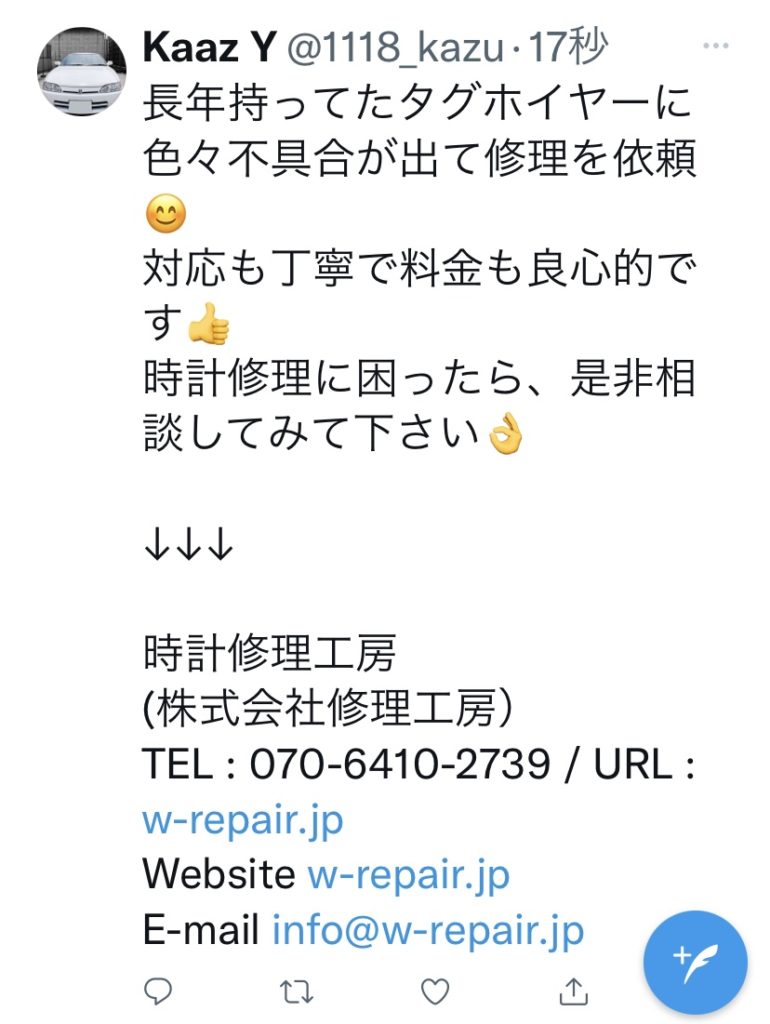 時計修理工房 (https://t.co/icnhUQpg58)というところを見つけて依頼。すごく丁寧に対応してくださって、無事手元に戻ってきたよ。よかった~。 pic.twitter.com/K6gREoOJZS