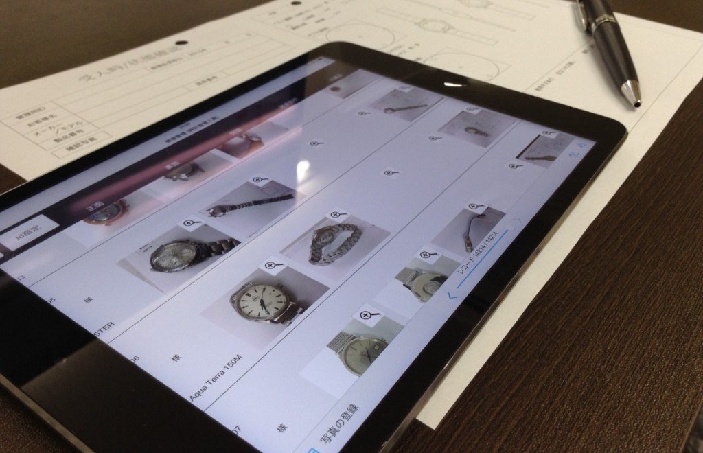 写真にあるのは、撮影や管理に使用しておりますタブレット端末と、お時計の状態を記す用紙でございます。遠くから届きますお時計も、窓口で直接お預かりするお時計もひとつひとつ状態を確認、記録し、撮影しております。