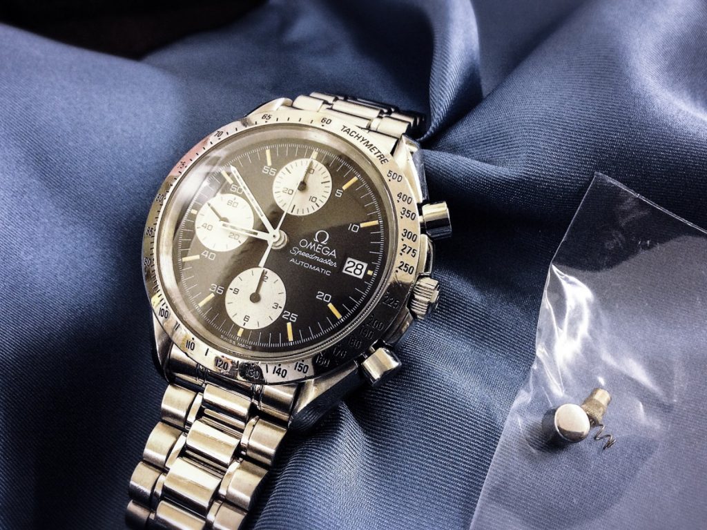 県外よりご来店にてお預かりしましたのは、自動巻のスピードマスター。ブラックの文字盤にホワイトの針が視認性を高め、タキメーターにデイトなどの機能も満載の、人気のお時計でございます。