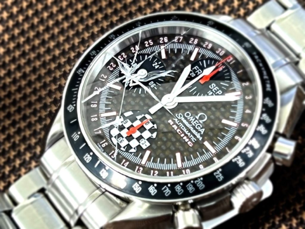 カーボン柄の文字盤とチェッカーフラッグ柄のスモールセコンドがいかにもレーシングなお時計でございます。