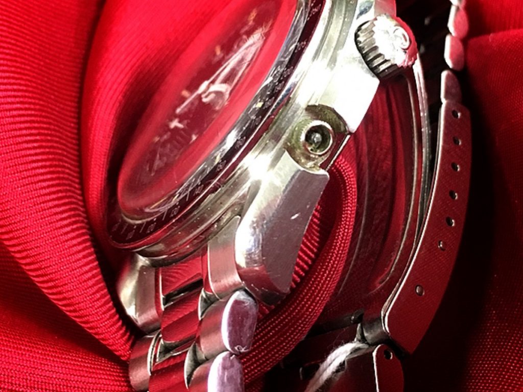 4時位置のプッシュボタンが取れてしまっております。破損箇所をよく拝見いたしますと、芯が折れてしまっているようでございます。プッシュボタンはボタンの中心の細い芯が機械内部に伸びておりますので、この部分が折れてしまいますとプッシュボタンが取れてしまいます。