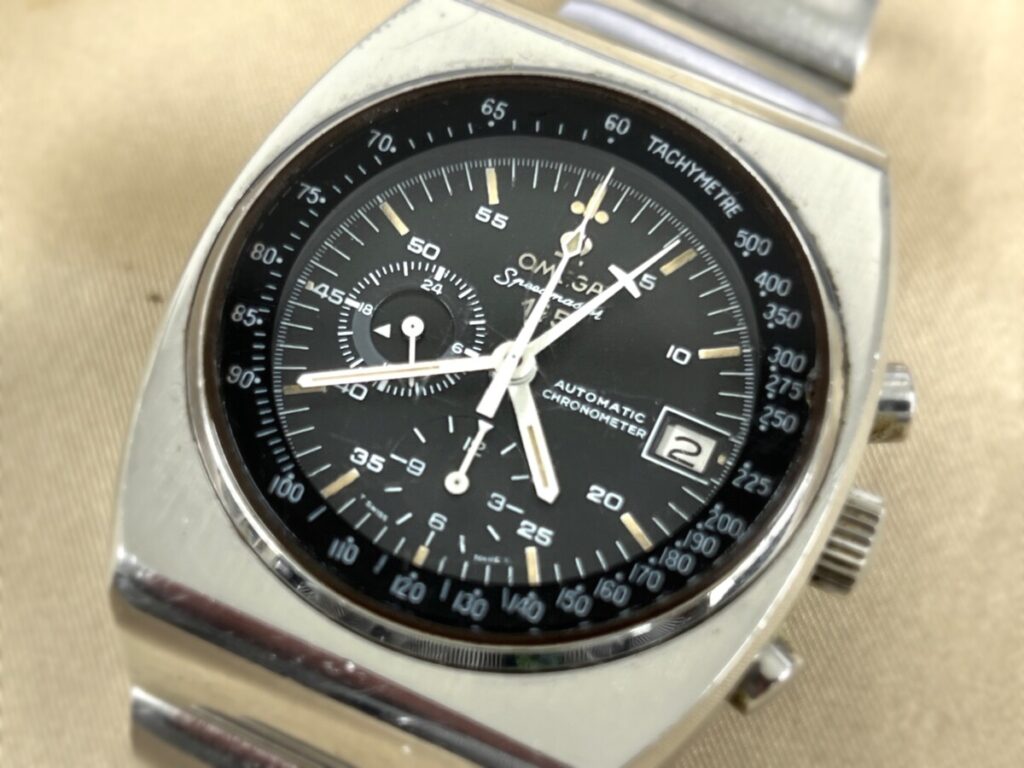 大振りな文字盤とケースの珍しいデザインのスピードマスターです。