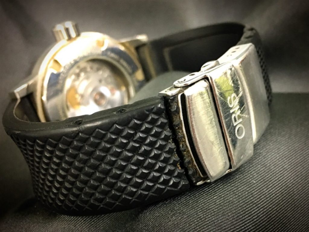 現在は、オリス純正のラバーベルトをつけていらっしゃいませうが、ラバーベルトが切れそうなってしまったので交換のご相談をいただきました。当初同じ純正ベルトでの交換を検討していただいておりましたが、同じ純正のラバーベルトが、国内に在庫がなく本国スイスから取り寄せる必要があるため、入荷に長らく時間を要してしまうこと。純正ベルトでの交換は高額になること。の理由から社外製ベルトもご検討いただいておりました。