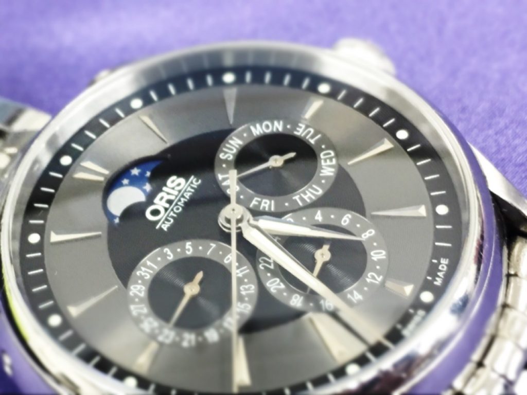 こちらのお時計は時刻に加えて、日付、曜日、24時間計、ムーンフェイズが搭載されております。