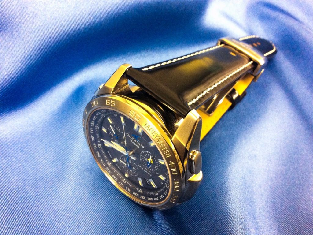 ご来店にてお預かりしましたのは、オシアナス。ギリシャ神話の海神に由来し、波をモチーフとしたロゴ、ポイント的に青がデザインされ、端正でシャープな印象のお時計でございます。