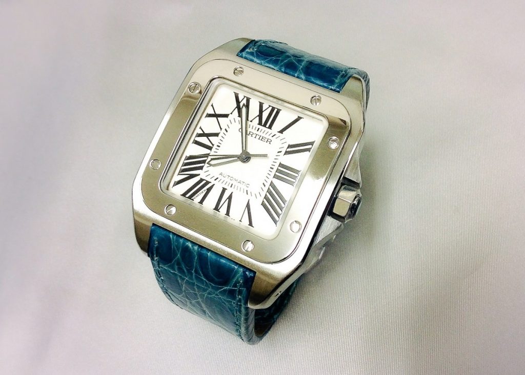 ご来店にてお預かりしましたのは、メンズモデルで人気の高いサントス100。サントス100周年記念モデルで、特有のネジ留めデザイン、かなり大きなサイズで重量感・存在感抜群。スポーティながらエレガントさも合わせ持つ素敵なお時計でございます。