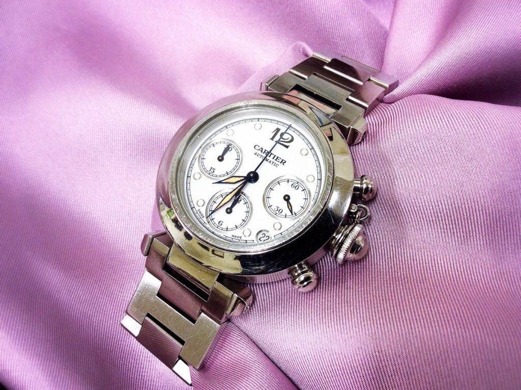 ご郵送にてお預かりしましたのは、パシャ クロノグラフ。ホワイト文字盤には角度により格子模様がくっきりと浮かび上がり、スタイリッシュでどのようなシーンにも活躍するお時計でございます。ご縁がご縁を呼び、ふたたびご依頼いただくことができ、とても嬉しく思います。