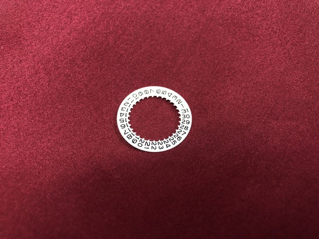 カレンダーの機構は様々でございますので、一概には言えませんが、多くは日送り車と呼ばれる歯車が、カレンダーディスクについている歯車に当たることにより日付を送ります。磨耗する対象は日送り車よりもカレンダーディスクの方が多いように感じます。(実績より判断しております。)本日の写真のカレンダーディスクもそうですが、素材がプラスチックのものもございますため、経年により歯車の山が磨耗し、やがて送れなくなります。