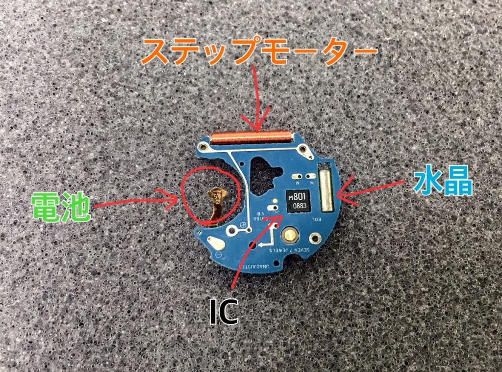 画像に矢印で【水晶】【IC】【ステップモーター(コイル)】【電池】と表記した部分が集結しているのがクォーツ式のお時計の回路でして、この回路と呼ばれる電子部品と、歯車などの機械部品の組み合わせで、お時計が構成されております。