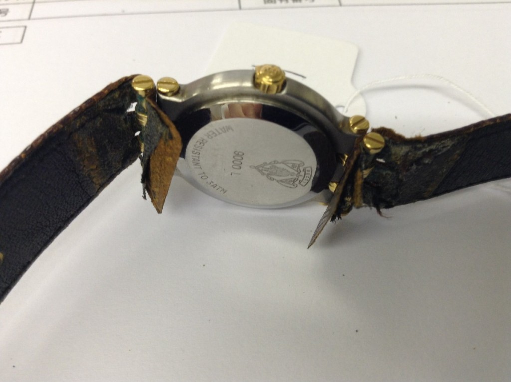 このお時計はベルトのケースとの接続部が3つに別れるよう切れ込みが入っており、交換するのに加工が必要でございます。そんなベルト交換と一緒に電池交換のお見積りをご提供いたしました。また現状動作は問題なくしておりましたが、今後のことも考えオーバーホールもおすすめしておりました。