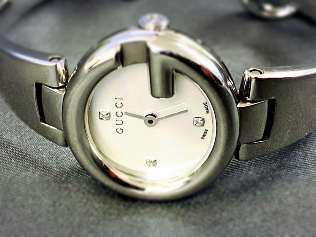 フェイスのベゼル部分に大きくグッチのGの文字をあしらったお時計となっております。