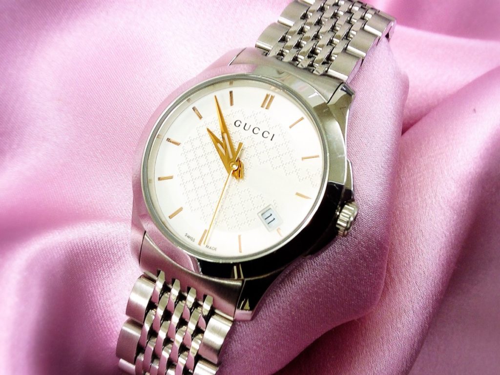 シルバーの文字盤全体をグッチのG、