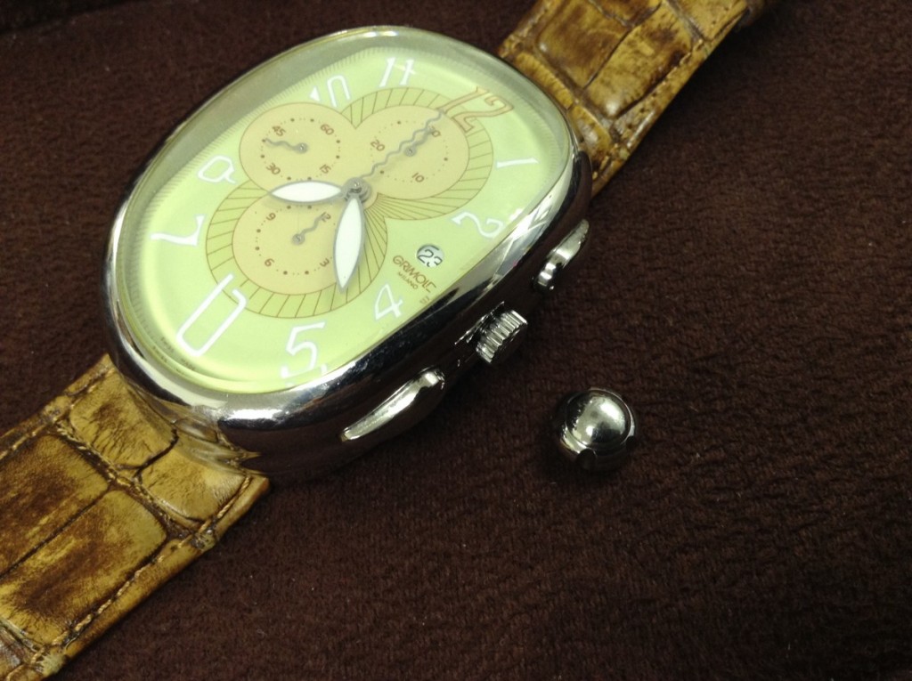 シルエットが特徴的なグリモルディのお時計です。名古屋市のK様より、リューズのお取り付け修理にてお預かりしておりました。
