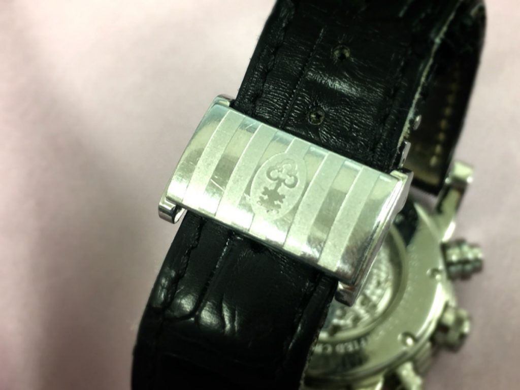 本日お預かりしたお時計は、オートマチックフライバックというモデルでございまして、クロノグラフにフライバックと呼ばれる機能が付いているタイプでございます。その機能とは、ストップウォッチを動作中に、リセットボタンを押すとストップウォッチの針が全て0に戻り、そのまま自動的に再スタートする機能でございます。その名の通り「フライ(飛んで)」「バック(戻る)」機能でござますが、通常通りストップボタンを押した後にリセットボタンを押して、針を初期位置に戻す動作をフライバックという方や、半円(または扇形)のダイヤルで針が端まで進んだ後に瞬時に初期値に戻る事をフライバックと言う場合もあり、少々ややこしいのでございますが、機械式の腕時計でフライバックというとこの機能の事を指します。