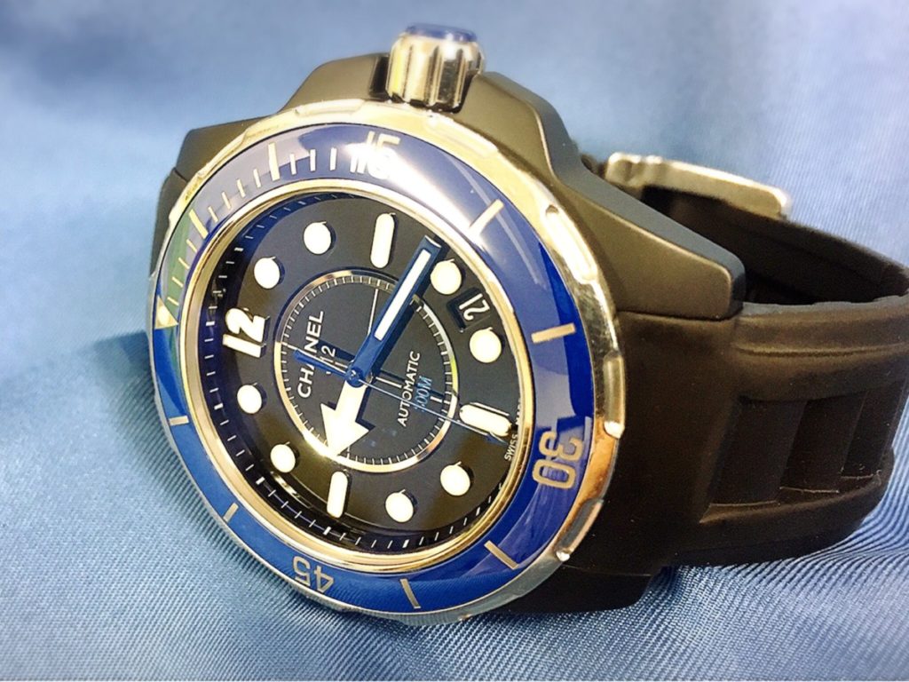 J12のダイバーズモデルでございます。300m防水と高い防水性能を誇っており、ベルトはラバーベルトを採用し水に強いモデルとなっております。人気の高いセラミックタイプのJ12も防水性はありますが、ベルトのコマの隙間やピンに汚れつきやすく、そのままにしておくと固着や錆びを招きますので、やはりラバーベルトタイプの方が水には強いと言えます。