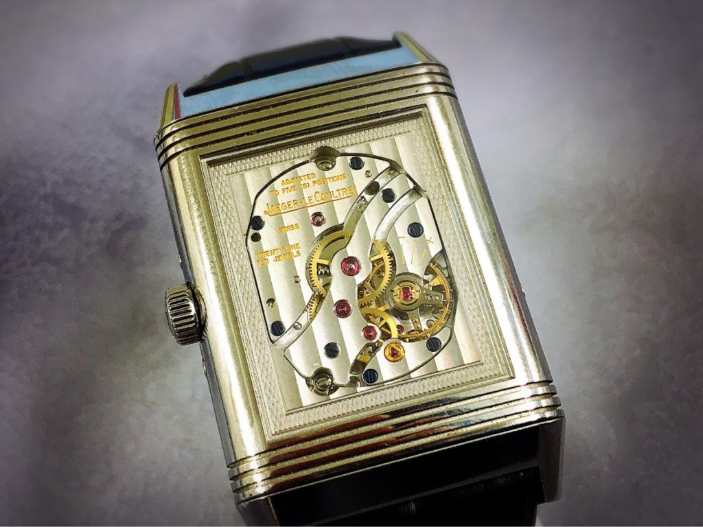 動作しなくなってしまったとのことでございますが、リューズの動きもかなり重く引き出しもうまくできないような状況でございます。レベルソ特有のケースが裏返せる仕組みになっておりまして、裏返すとスケルトンでムーブメントを見ることができます。レベルソは四角形のケースに四角形のムーブメントは収まっている、機械式腕時計としては珍しいタイプの時計でございます。丸型の歯車や機構の集合体である機械式腕時計は、機械全体も丸型の方が部品の収納に都合が良ため、四角いムーブメントですと部品の配置が難しくなってきてしまいます。あえて四角形のムーブメントにしているところにジャガールクルトの技術力の高さが伺えます。