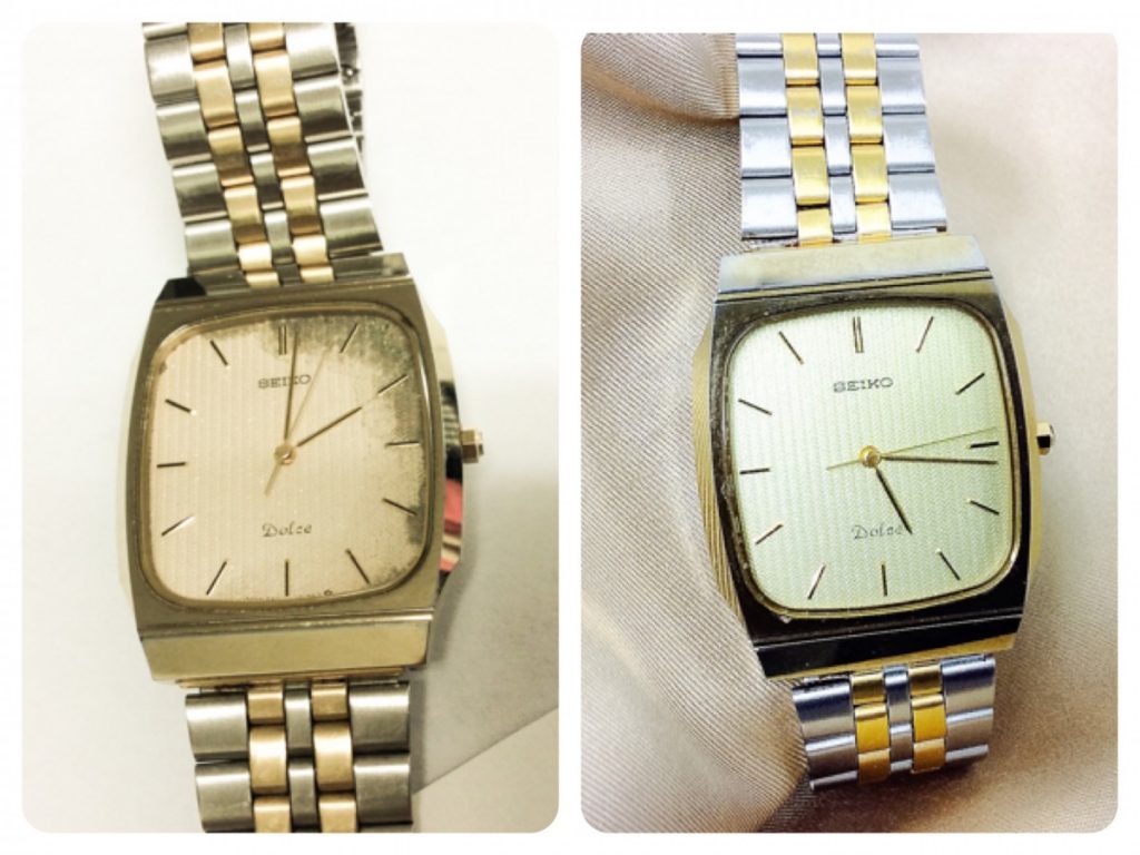 ご来店にてお預かりしましたのは、ドルチェ。キラキラと輝きを放つ文字盤と、細く繊細なバーインデックスに針がスマートにデザインされた、素敵なお時計でございます。