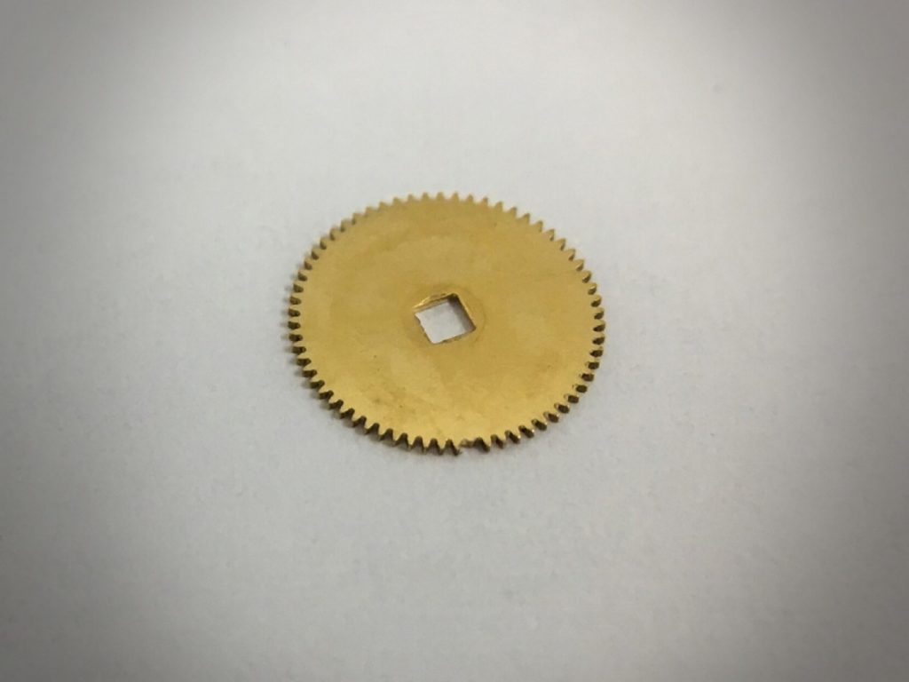 角穴車の歯が欠けてしまっていたので交換となりました。角穴車(かどあなくるま)とはその名の通り角(かど)のある穴が開いている歯車のことでございます。この歯車は主にゼンマイが収められている香箱(こうばこ)と繋がっており、ゼンマイを巻き上げるために回っております。歯が欠けてしまいますと、巻き上げ不良が起こりローターを回したり、リューズを回して手巻きをしてもうまくゼンマイが巻き上がらないなどの不具合が発生してしまいます。歯の1つ1つはとても小さく、少しの衝撃が加わっても破損してしまうこともございます。巻き上げに使われるため、負担が大きい部品の一つであり、交換が必要になる修理は割と多くございます。