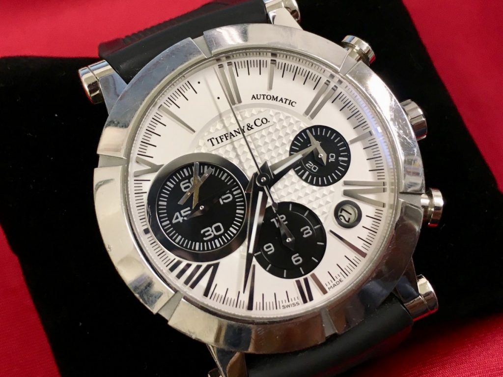 本日はティファニーのお時計をお預かりいたしました。シルバーのケースにブラックのラバーベルトがあしらわれたお時計です。ホワイトの文字盤にブラックのクロノグラフが配置されておりクールなイメージの時計です。
