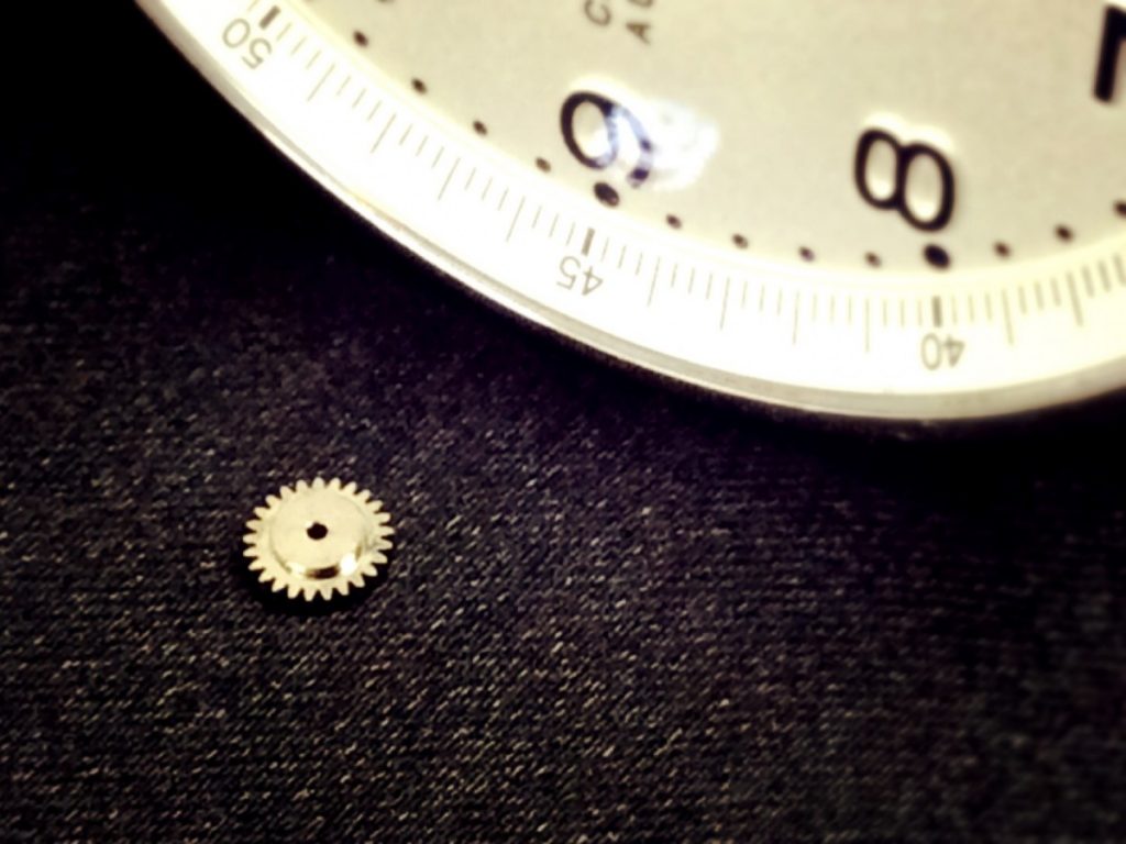 筒カナとは、二番車(一時間で一回転する分針(長針)を動かす)と同時に動く歯車のこと。時刻を合わせる際に、筒カナと二番車の芯がすべることで分針を操作することができます。指の先ほどの小さな部品ですが、破損してしまえば分針が動かなくなってしまうのです。