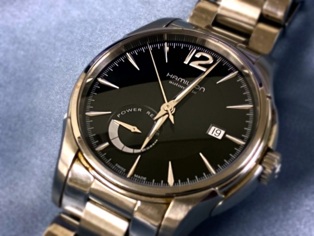 ハミルトンの自動巻きのジャズマスターと思われるモデルをお預かりいたしました。パワーリザーブのついているモデルになります。