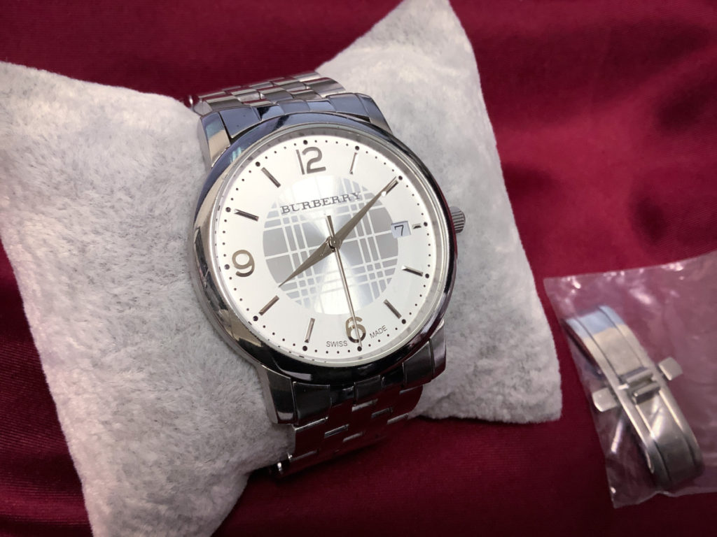 ホワイトの文字盤には、シルバーのバーバリーチェック。