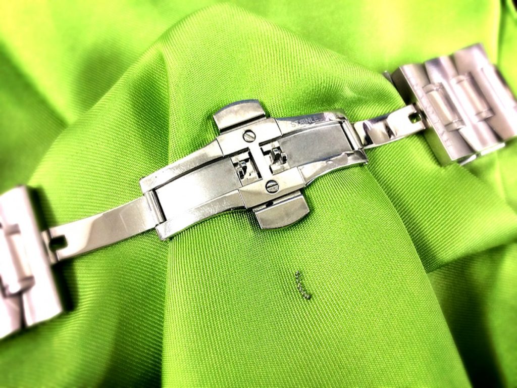 取り出してみました。お写真のとおり、とても小さなバネの部品。こちらの部品の劣化が、バックルとしての機能を妨げていたのです。
