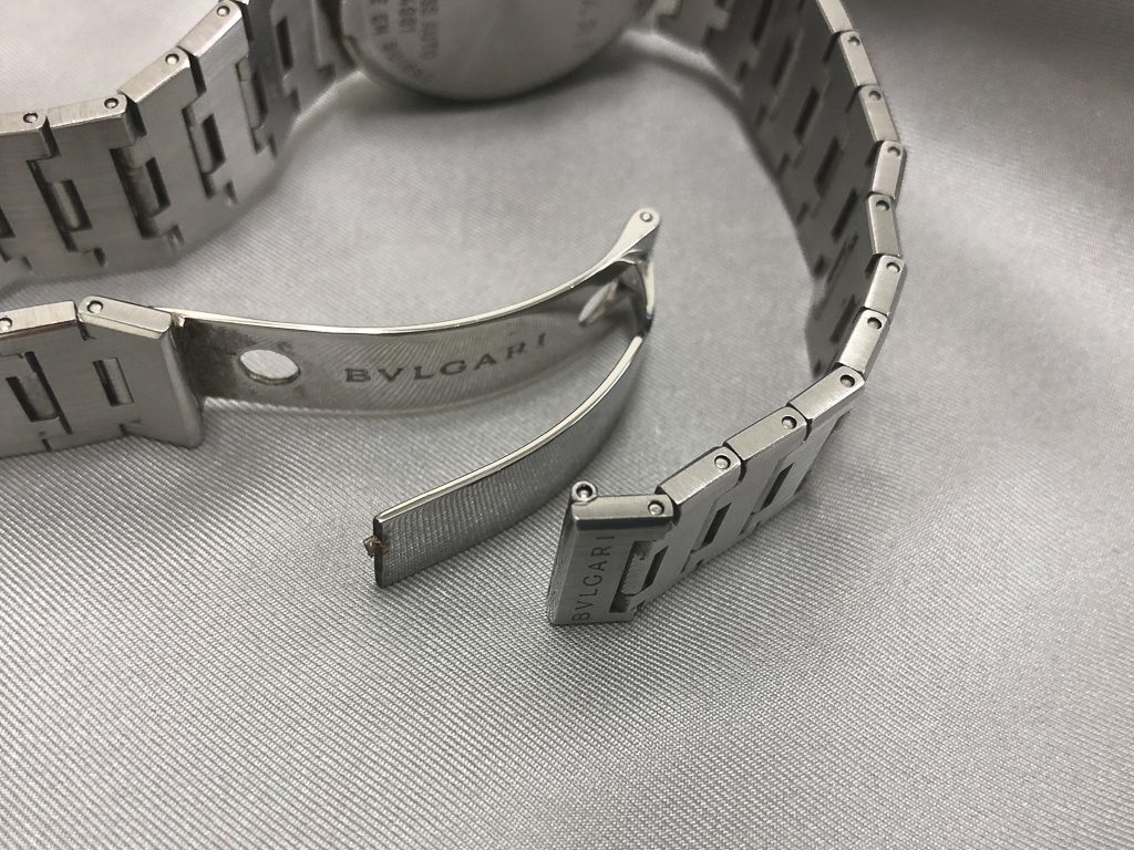 早速お時計の不具合箇所を確認したところ、バックルの12時側の溶接部分が金属疲労により剥がれた様な見た目で外れております。