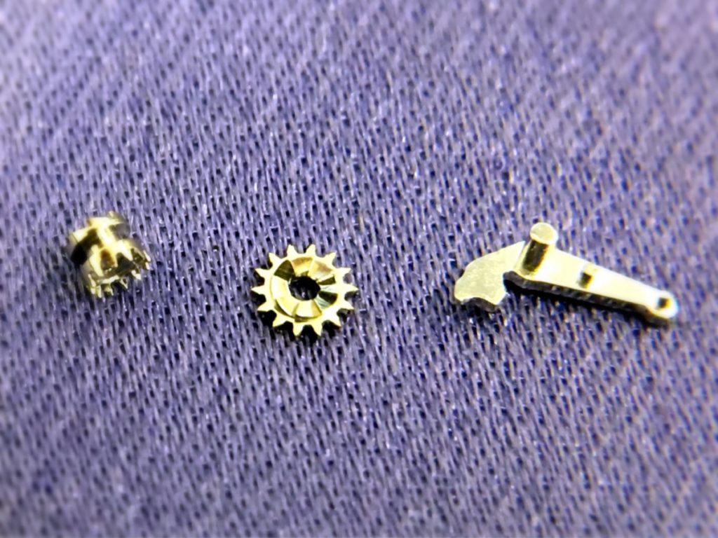 リューズの頭部分から伸びる芯の部品である巻真の先についている、3つ部品を交換をさせていただきました。