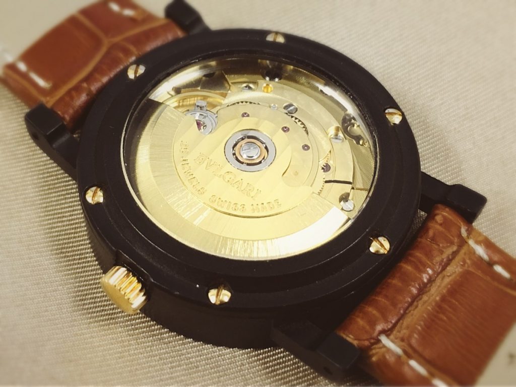 こちらのお時計は、ブルガリの中でも珍しいケースがプラスチック製であり、裏ぶたがスケルトン仕様になっております、機械式時計で裏ぶたのスケルトンはポピュラーでございますが、ブルガリのお時計では珍しいタイプでございます。裏ぶたから見える内部機械はゴールド仕様でございまして、普段見えないところが隠れた豪華さになっております。