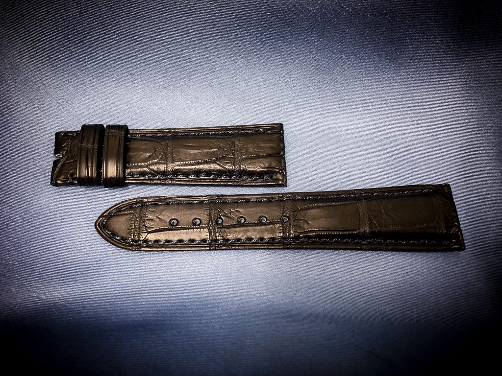 ケース側の厚みが分厚く、剣先(ベルトの先端)にかけて厚みが薄くなっていくデザインで、こちらのベルトは、ブレゲのトランスアトランティックタイプXXIの純正バックルに適合するベルトでございます。