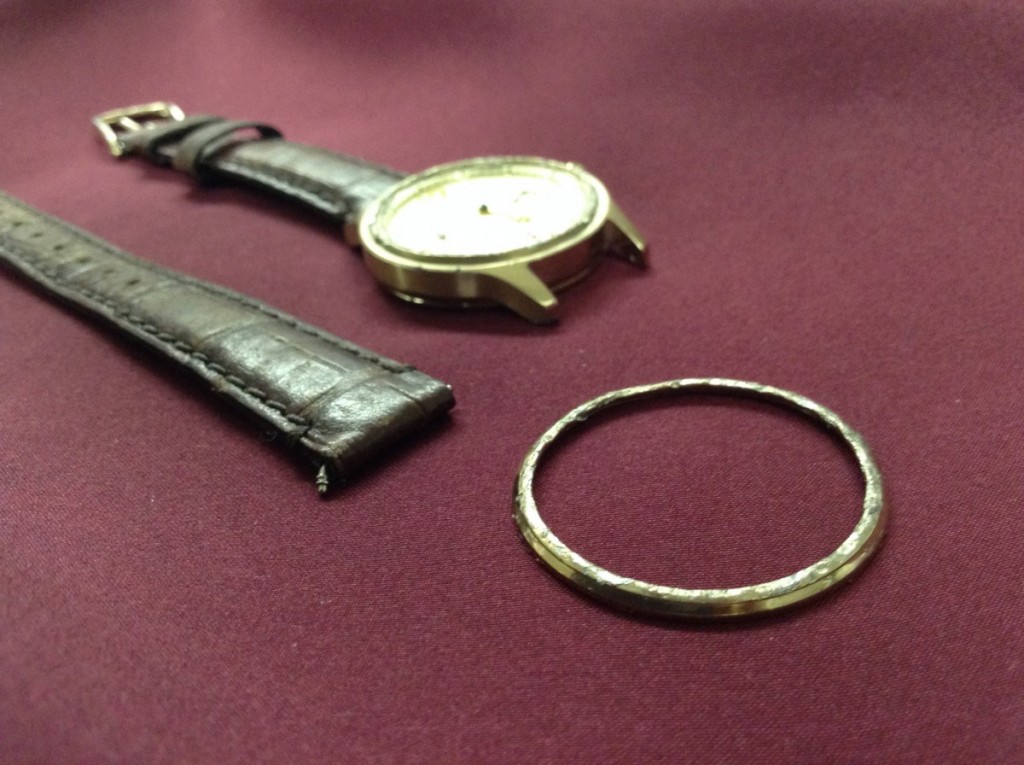 どこか悲しげな様子もあったS様が置いたお時計は元の形をとどめていないものでございました。ガラスは完全になくなりケースのキズも深く、文字盤がへこんでしまっているそのお時計は、探して見つけた時には道路の上でこの状態だったとのことでございます。