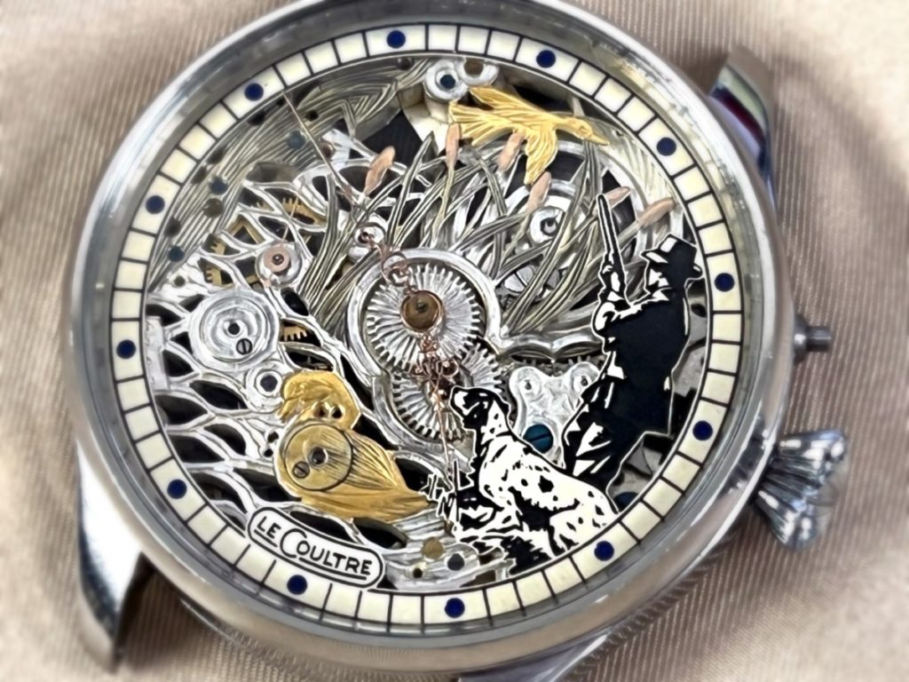 文字盤と地板がスケルトンになっており、ハンターと犬が鴨猟をする様子が彫刻されています。