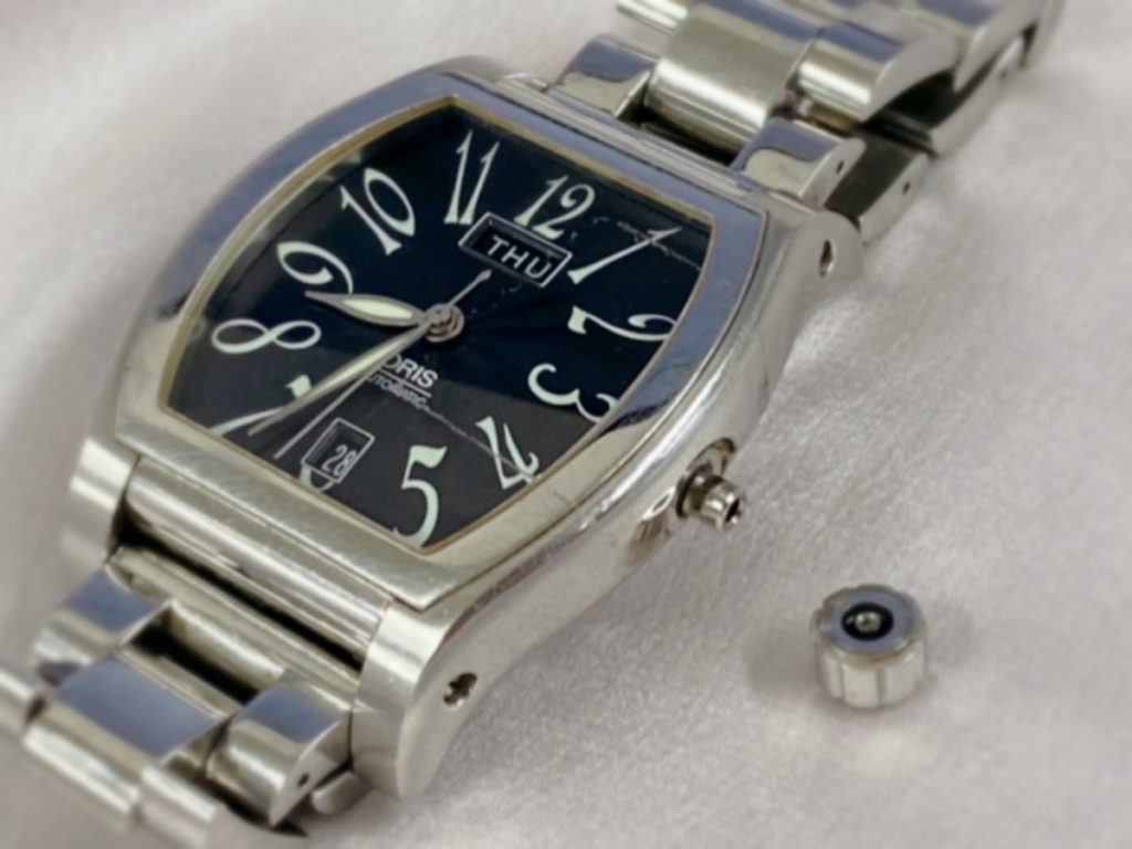 オリスのリューズは、モデルによっては大きいため、操作はしやすいのですが、反面ぶつかりやすかったり、力を入れやすかったりするせいか、リューズ破損のご相談もよくいただきます。
