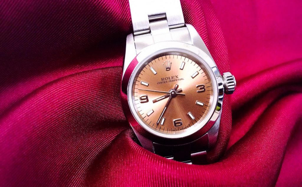 ご郵送にてお預かりしましたのは、オイスター パーペチュアルのレディースウォッチ。サーモンピンクの優しげな文字盤カラーに、視認性の良い大きめインデックス。どのようなシーンにもお使いいただける、シンプルで可憐なデザインのお時計でございます。