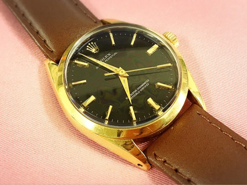 金色のケースにインデックス、針、文字盤ばブラックのアンティークのロレックスでございます。