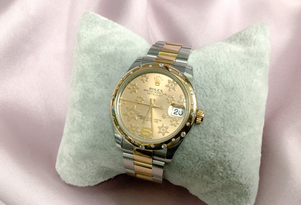 立体感ある花模様の文字盤に同色の3針と、3時位置にデイトの小窓。