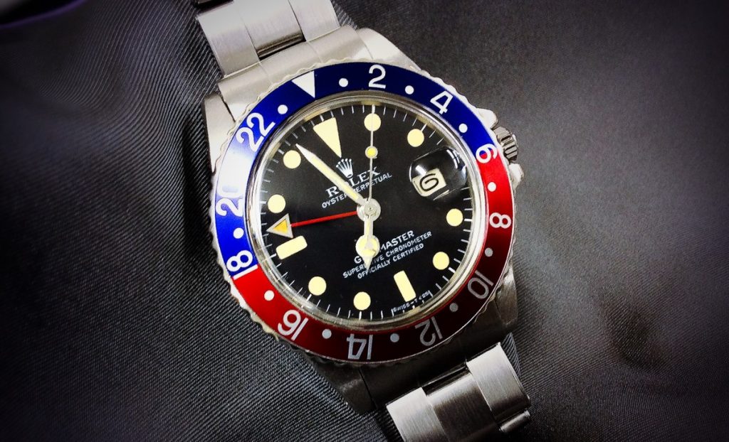 ご郵送にてお預かりしましたのは、オールドタイプの GMT マスター。ツートンカラーの青赤ベゼル、インデックスにシルバーのふちの無いオールドタイプでございます。視認性抜群でデイト付き、アンティークな風合いを持ち、現在でも人気の高いお時計でございます。
