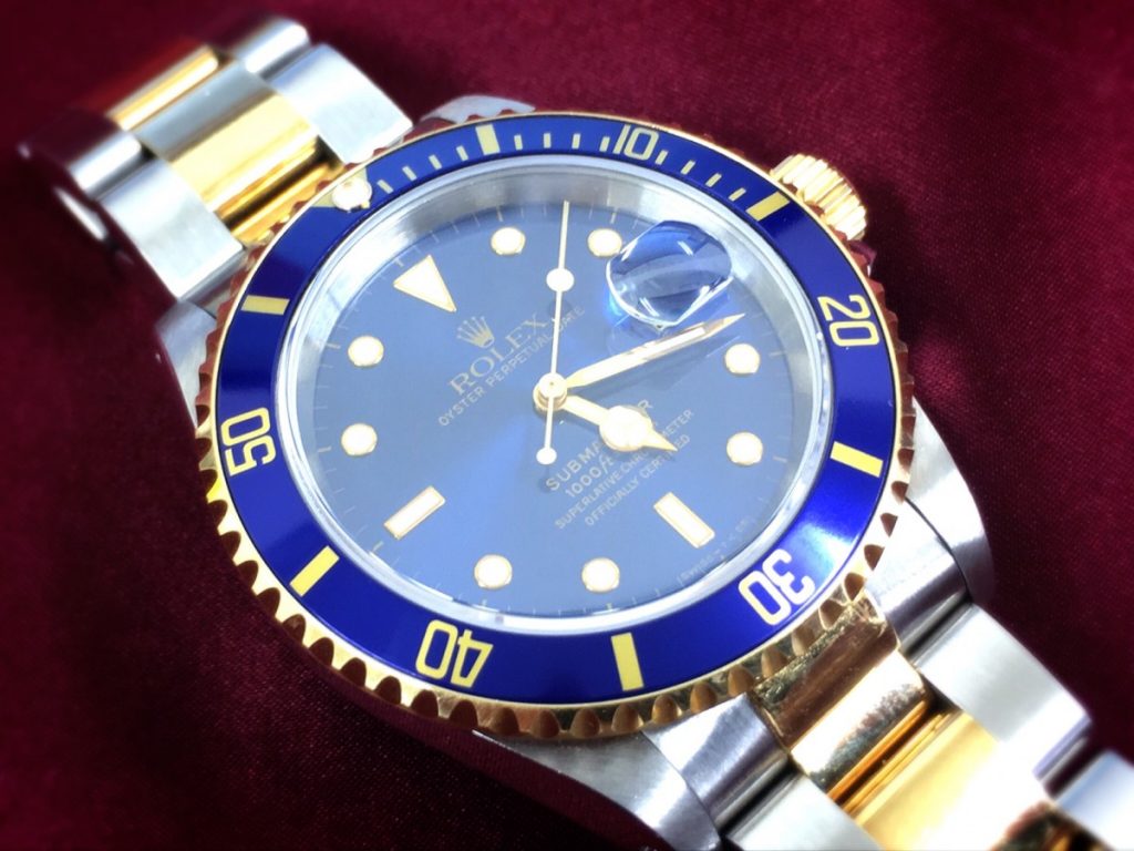 ブルーの文字盤とベゼルリング、ゴールドのベゼル・リューズ・コンビネーションのベルトがロイヤリティー溢れるお時計でございます。20年前からご使用とのことでございます。
