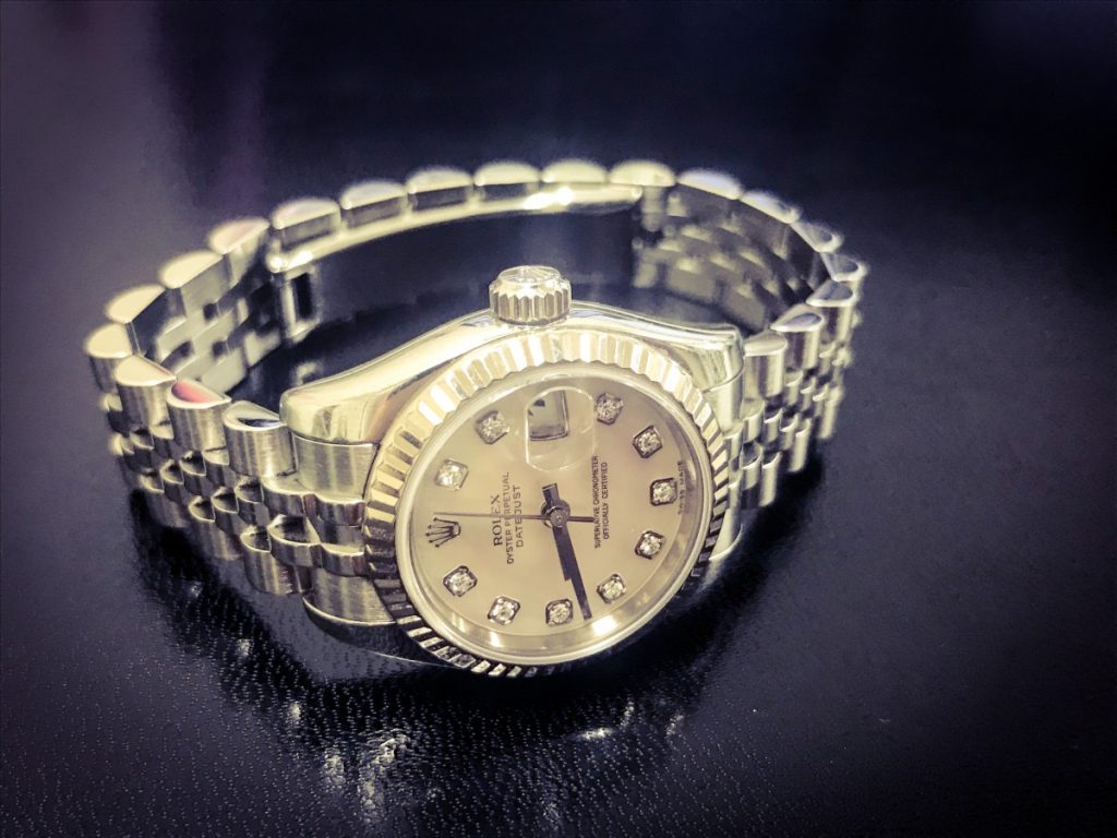 シェル文字盤とインデックスが輝くロレックスのデイトジャストのメンテナンスを承りました。