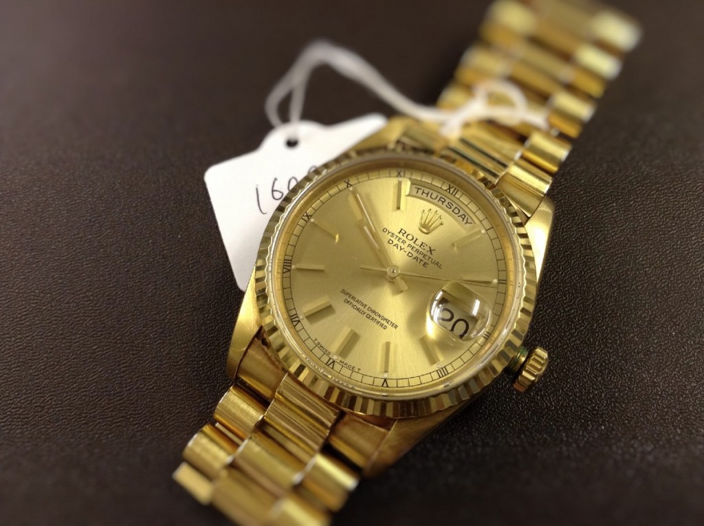 窓口にご来店いただいたE様より、金色に輝くロレックスのお時計をお預かりしました。ねじ込みロック式のリューズが飛び出し、奥まで押し込めない状態でございます。