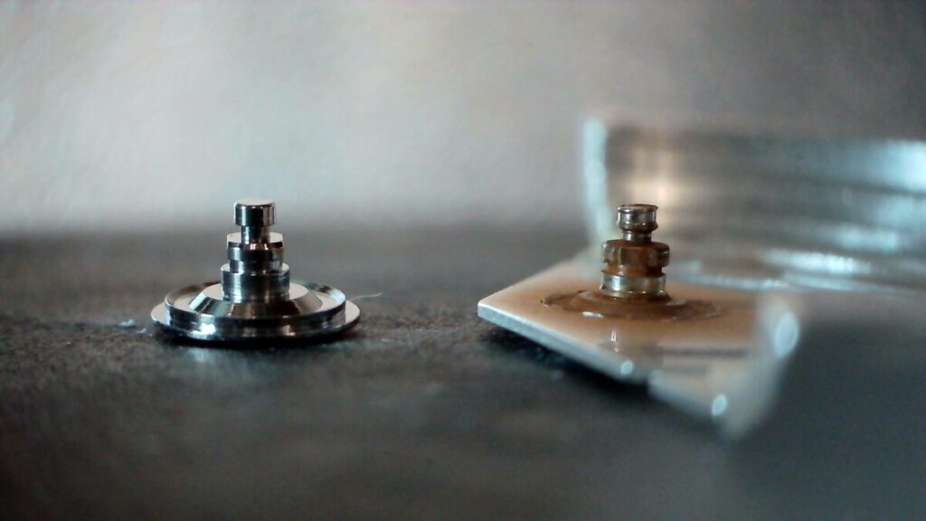 時計内部の潤滑油が乾いた状態で使用を続けると、金属同士が直接擦れ合い、右側の写真のように激しく削れてしまうのです。