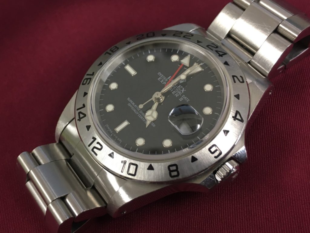 ロレックスのエクスプローラIIには、時刻を指す時針・分針の他にもう一つ24時間計の針がついております。この針は、洞窟のような太陽の光の届かない場所に長時間にわたり滞在する時にも、昼夜の区別つくようにと付けられた機能でございます。そのためこのモデルの名前は「エクスプローラ(冒険)」となっております。