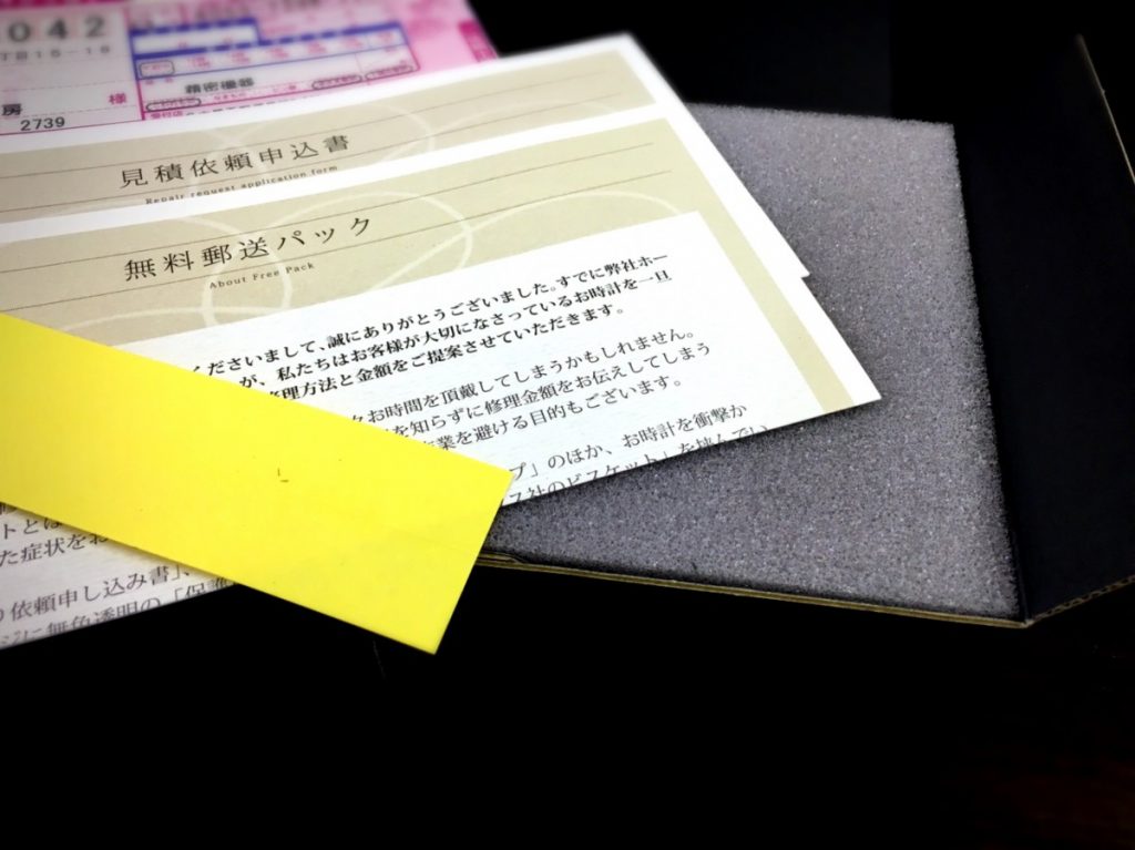 修理工房に郵送にてお時計をお預けしてくださったお客様はご覧になられたことがある箱だと存じますが、詳しい説明をさせていただきます!。この黒い箱は、当工房が全国のお客様に安心してお時計を郵送していただけるようにと、考えられた箱でございます。箱を開けていただいたらまず目に入るのは、当工房行きの「着払い伝票」とお時計の症状をお書きいただく「お見積依頼書」、梱包ボックスの説明書とお時計を入れていただいた後に箱の口を閉じていただくためのテープでございます、その下にお時計を完全にホールドできるスポンジが箱いっぱいいっぱいの大きさで入って入りまして、お時計を入れていただいた際しっかりお時計を守ってくれます。そして箱の中心にはお時計を包んでいただくビニールパックと薄いビスケットが入っておりまして、お客様へおもてなしの心と、ビスケットが割れていた時に、郵送ルートに何らかの原因があると想定し、事前にお時計の危険を減らすことができます。ですのでビスケットが割れていたらお時計を郵送せずにご一報いただけたらと存じます、細い説明でしたがおわかりいただけたでしょうか?お客様のご愛用されている大切なお時計を安全に当工房へ郵送していただく無料郵送パックのご紹介でした。ありがとうございます。