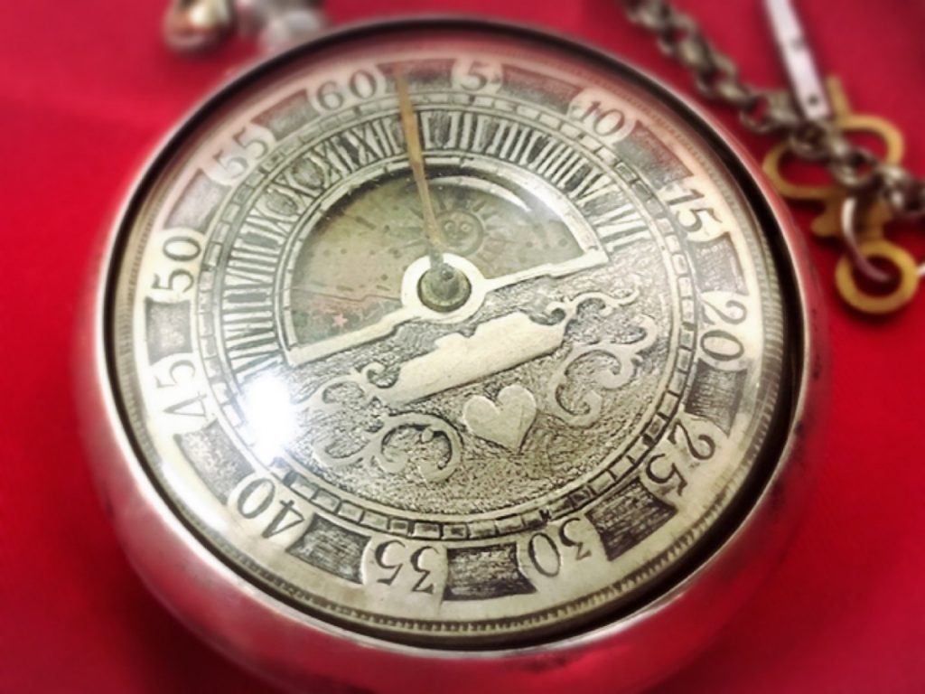 本日は懐中時計をお預かりいたしました。イギリス製の古い懐中時計とのことですが、どうやら1800年頃に製造されたもののようでございまして、今より200年も前のものでございます。日本はその頃まだ江戸時代、徳川家が治めていた時代でございます。そのような時代に作られたお時計が最近まで動いていたというのですから驚きです。恐らく当工房でお預かりした時計の中で一番古いものではないでしょうか?文字盤には針が1本ございます。片方の針は紛失しているのかと思いきや、これが正しいようで分針のみのタイプであり、ムーンフェイズのような窓が時針の役割をしているようです。ムーンフェイズの周りに1〜12のローマ数字が刻まれております。分針の指す時刻はアラビア数字でございますね。1つの文字盤に2種類の表記があるのも大変珍しいです。全て彫刻されている文字盤と歴史を感じられる風合いは、まるでファンタジー映画の魔法のアイテムようでございます。200年前の時計の修理が可能なのか、職人に詳しく拝見していただきます。