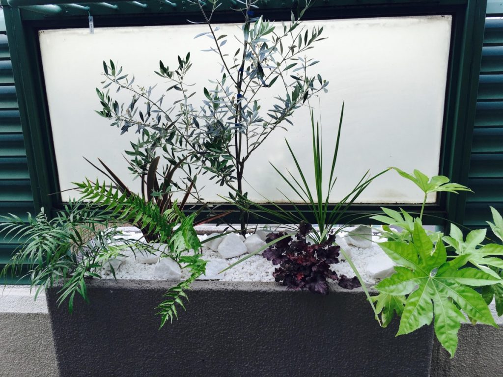 先週に植栽前の花壇の写真をブログに書かせていただいた近藤です。本日は日曜日に植栽を完了しました花壇の紹介をさせていただきます。イメージとしましては。修理工房の窓口と同じ南国風な雰囲気でして、中心にはオリーブ、周りにはヤシ科の植物を散りばめ、根元には白のストーンを敷き植物を際立たせました。今は植栽したばかりですので少し頼りない植物ですが、夏本番に向けて成長していくように手入れしますので、当工房窓口にお越しの際は是非ご覧ください。