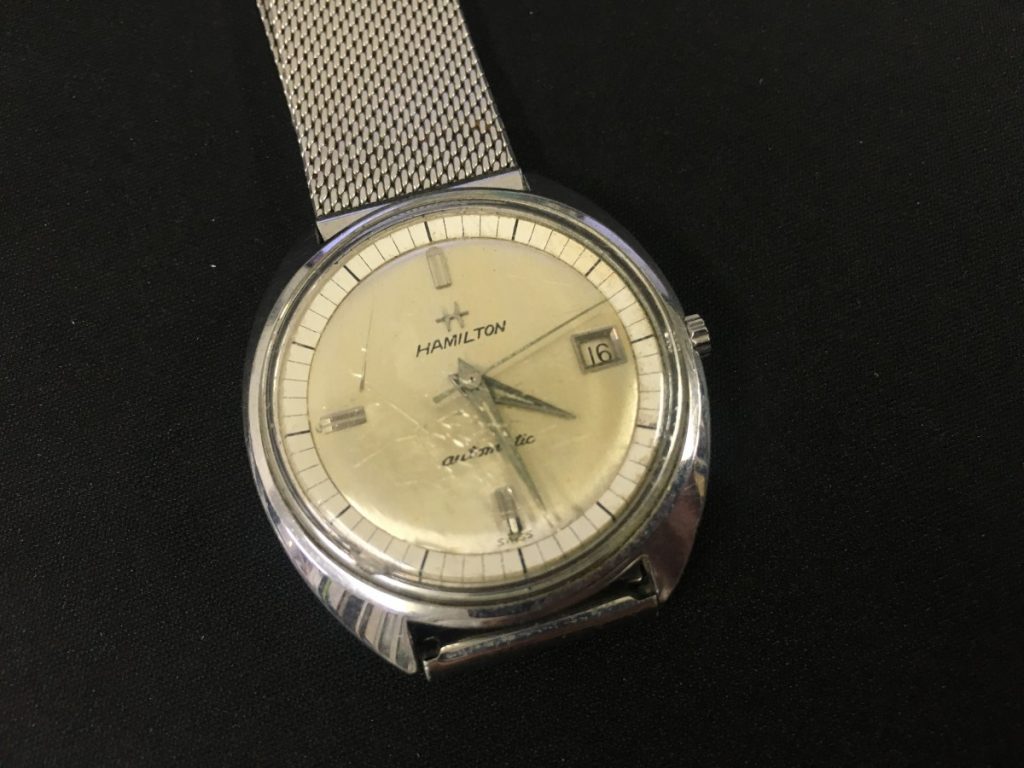 見出しにも書かせていただきました、40年ほど前のハミルトンでございます。お客様いわく、40年ほど前にハミルトンが初めて自動巻のお時計を出した時に購入した、自動巻のお時計とのこと…すごいですね!ハミルトンの中では初めての自動巻、歴史があるお時計です。お客さまはご自身でご購入されたお時計をどれも数十年大切にご使用されていて、ご愛用しているお時計は30年から50年ほど前のものが多いとのこと、お時計の修理のお力にならせていただく立場から考えますと、1つのお時計を長く大切にご使用されている、大切なお時計のメンテナンスを任されると胸が熱くなります。今回メンテナンスを任されたハミルトンは動作がしなくなってしまったとのこと、早速確認させていただき風防は経年劣化によりヒビが入っていますが、リューズの磨耗もありませんし外装、ベルトも非常に綺麗です。動作するようお力になります!。