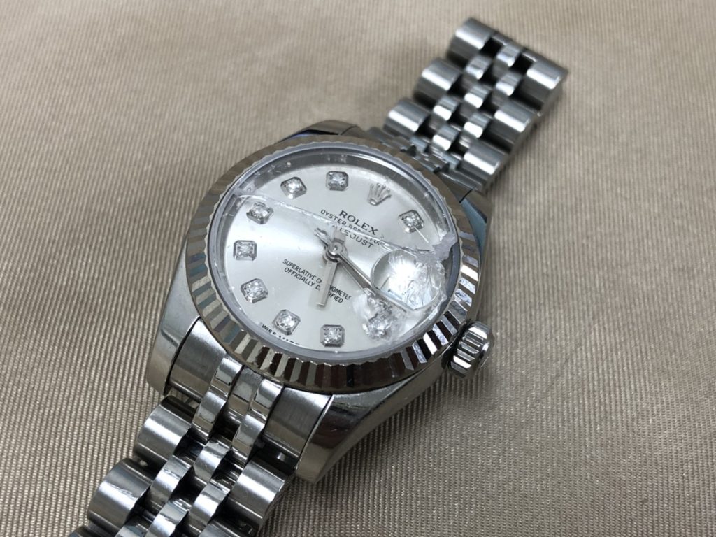 ガラス片が文字盤上に散乱していますので、内部機械の状態が心配です。