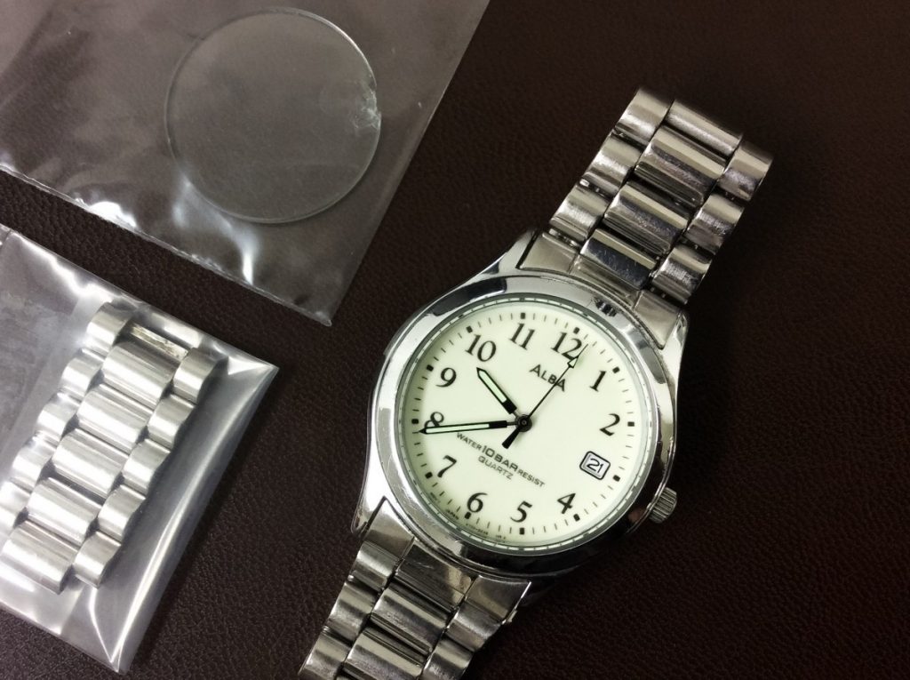 セイコーウォッチ株式会社から、様々なデザインのお時計が世に出されていますALBA。お預かりしましたのは10気圧防水のカレンダー機能付きクォーツのお時計でございます。夜光塗料の針はシンプルな文字盤にも映え、スッキリとしてとても見やすいです。